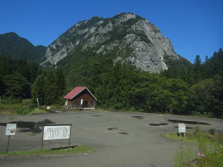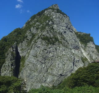 | 小滝川ヒスイ峡駐車場から見る明星山の岩壁 |