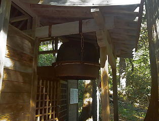 | 御鍋神社。大きな釜が逆さに吊るされていました。ここから駐車場へは遊歩道を辿りました。 |