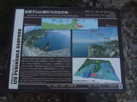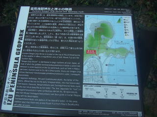 登山口のある雲見浅間神社の参詣者駐車場にある神社の解説と案内図