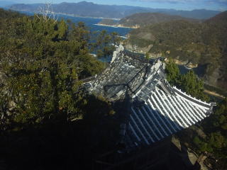 山頂の展望台は猛烈な風で写真を撮ることはできませんでした。展望台の床より頭がちょっと下がるところまで降りると風が弱くなり神社の屋根越しの景色を撮ることができました。