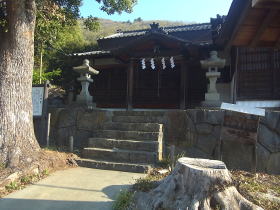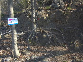 | 拝殿脇の道標。ここに別の道も達している。 |
