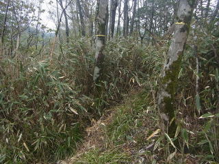 | 浦安峠に下る道のヤブの濡れ具合は大したことはなくずぶ濡れにはならずに済みました。結果としては城ヶ尾峠から下山しないでよかったと思いました。だがずぶ濡れになっていたら、冷たい風が吹き出した時にはとても寒い思いをしていたような気がします。 |