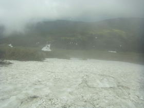 | 山頂の先の雪の斜面を半分ほど下って雪のようすを見ると2年前と同じようでした。 |