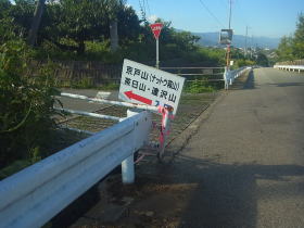 | 林道の工事現場脇のゲート。ゲートの先へ行ってしまいましたが変だと思い戻り、よく見ると草木に隠れたこの道標がありました。ここから達沢山までは明瞭な登山道があり、道標もありました。 |