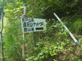 | 二本木山には気づかず林道に出てしまいました。林道の進むと林道の分岐に京戸山林道入口と書いてありました。 |