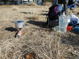 | 大平山直下の草原で恒例のカップ麺とコーヒーを味わいました。 |
