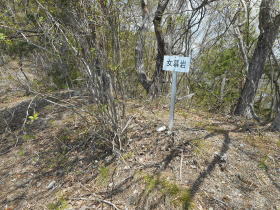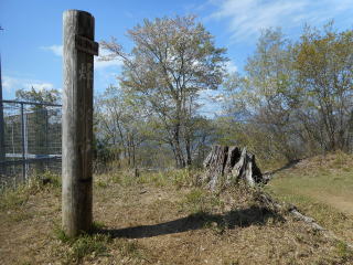 | 岩殿山。烽火台と書いた標柱があり634とも書いてある。大月市の岩殿山無線中継所がある。 |