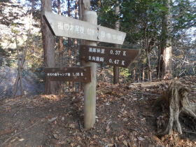 | 梅の木尾根の痩せたところに雪があったら大変だと思いストックと軽アイゼンを用意しましたが雪は全くありませんでした。地面の水分が少ないせいか霜解けで滑りやすいところやぬかるみで歩きにくいところもなく、上空はすっきりとした晴天にもかかわらず大山からの眺望は霞んでいて冬らしくありませんでした。 |