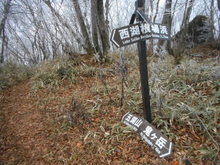 | 王岳山頂間近の西湖根場浜を指す道標 |