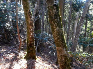| 木に生えた苔が逆光で木をみどり色に縁取っているのが鮮やかだったのでパチリ。 |