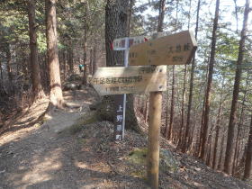| 念願の甚之函山に行くことができました。矢平山からまっすぐに進むと旧大地峠には行かず新大地峠に行くようになっていて以前来たときには旧大地峠への分岐を見逃したようです。 甚之函山の山名は石に書いたものを木に縛り付けてありました。このような山名表示は他では見たことがないような気がします。 |