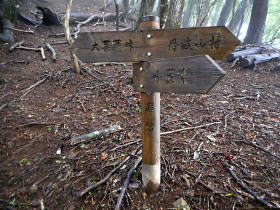 | ノーメダワ。小菅村と書かれた道標もあり大菩薩峠登山口とフルコンバを結ぶ道に出る道があるようです。サカリ山を通るルートは踏跡が見当たらないところが多く濡れた藪を漕ぐ所もあって大変でしたが、追分からの一般道は林道と見違えるばかりの立派な道でした。 |