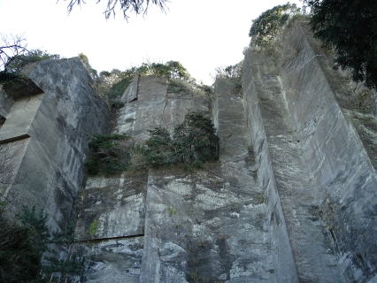 | 石切場跡。切り取った面の高さもあり、オーバーハングになっているところもあって切り出しは大変な作業だったようです。 |