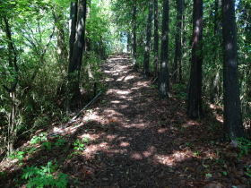 | 落葉の山道に射す木漏れ日。無風で暑いが気持ちよく歩ける。 |