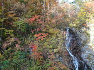 | 森林館付近から三頭大滝に向かう道には分厚くチップが敷かれ独特の歩き心地です。その道から見た紅葉。 |