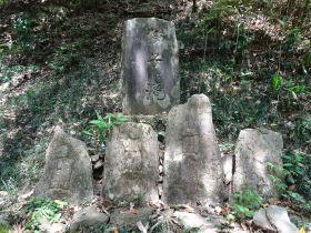 | 銚子ヶ滝の碑。前の仏像は磨崖仏風に彫られた非常に浅いレリーフでした。 |