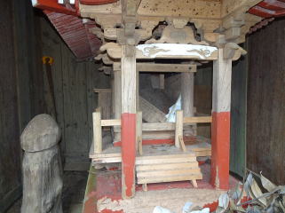 | 登山道が石段に出て見上げると社があり行ってみました。神社の名前はありませんが男根が祀られていました。 |