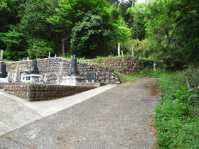 | 車道の終わる所に墓地がありその右奥が不老山に続く山道の入口です。 |