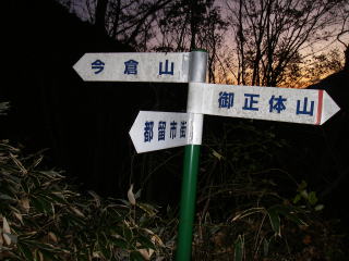 | トンネルの上の御正体山分岐に着いた頃に日の出といった感じだった。 |