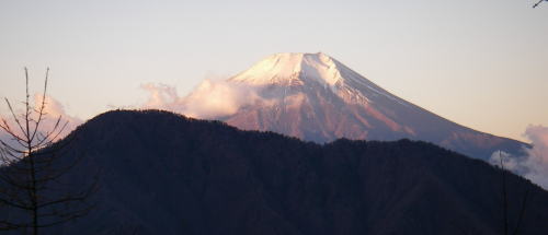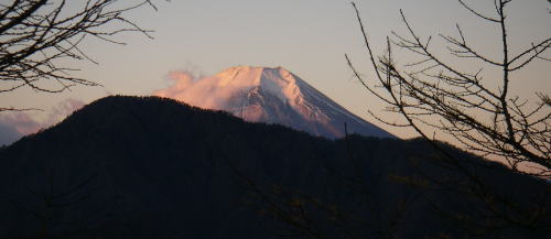 | 今倉山への登りの途中から振り返って見る御正体山を前景とする富士山。オレンジ色に染まっている時間は短い。 登山道は樹林帯にあるので木々の間に富士山はいつでも見られるが、木にじゃまをされずに写真を撮れるところは少ない。 |