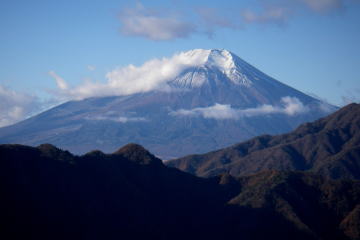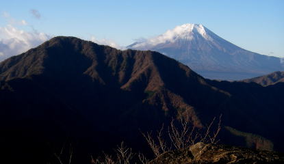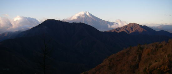 | 今倉山西峰のちょっと先から見た富士山。 黒い影になっているのが御正体山。右手の朝日の当たっている山は杓子山。 |